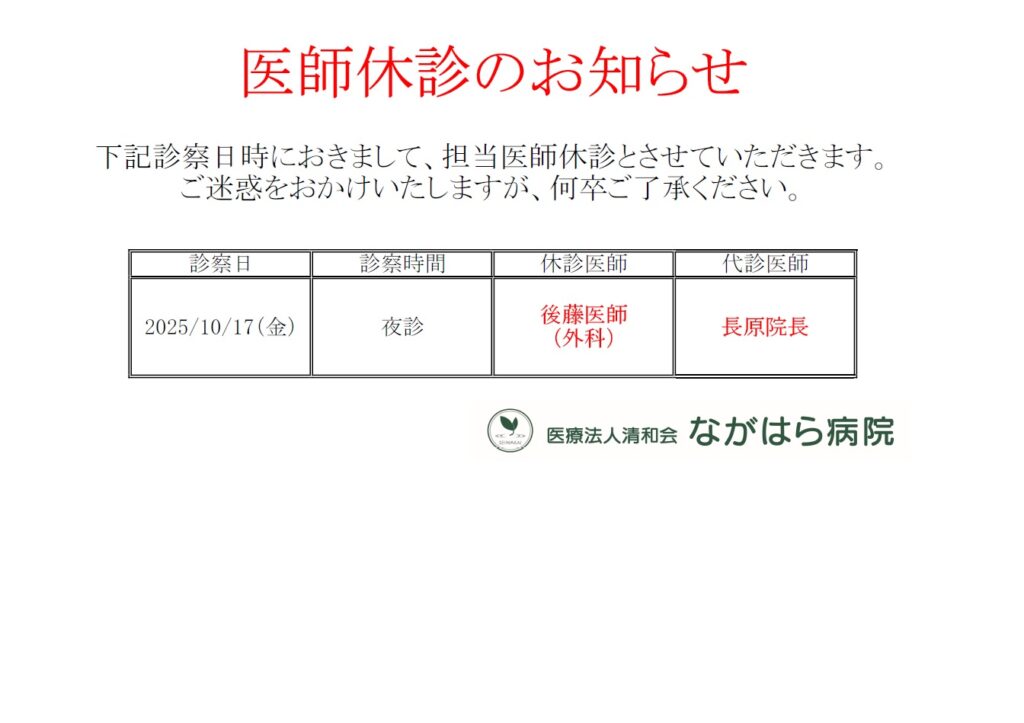 2025年9月19日 / 最終更新日 : 2025年9月18日 nagahara-hp_cl 患者さま 医師休診のお知らせ 2025年10月17日(金)夜診におきまして後藤医師休診とさせていただきます。 ご迷惑をおかけいたしますが、何卒ご了承ください。